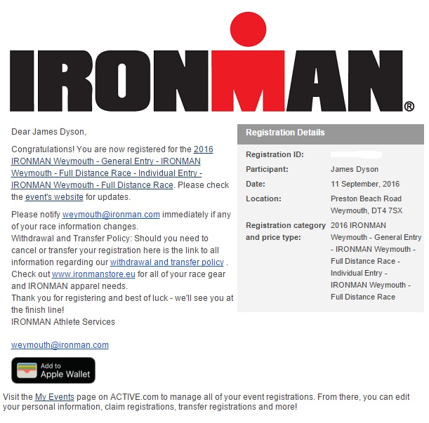 The other big development this week is that I’ve paid my fees and entered the Weymouth Ironman. £400 seems like a lot of money to pay for what will be a painful 12 hours, but I’m fully convinced the enjoyment comes from the preparation and planning. The day out itself will be hard graft, but knowing I can do it will be the petrol that gets me through.