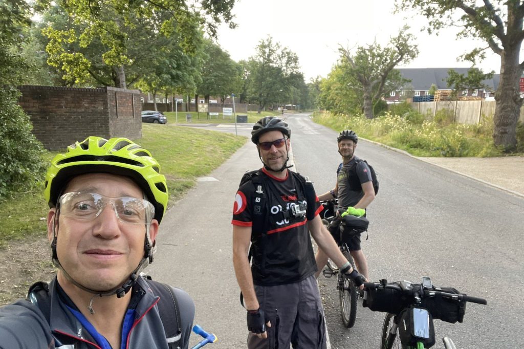 6:55AM and I’m rolling down the hill, tyres quietly humming on the tarmac, temperature perfect for a t-shirt and shorts and the sun beginning to peak through the haze. What a beautiful morning, legs barely registering the pedals as I get to the meeting point half an mile from the house. Rolling up, the other guys are there, all smiles, bikes loaded and ready to go, a quick starting photo and off we went, chatting as we wound our way up to Ewshot. Day 1 underway.